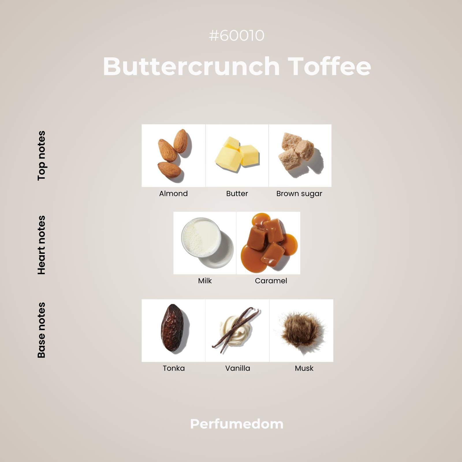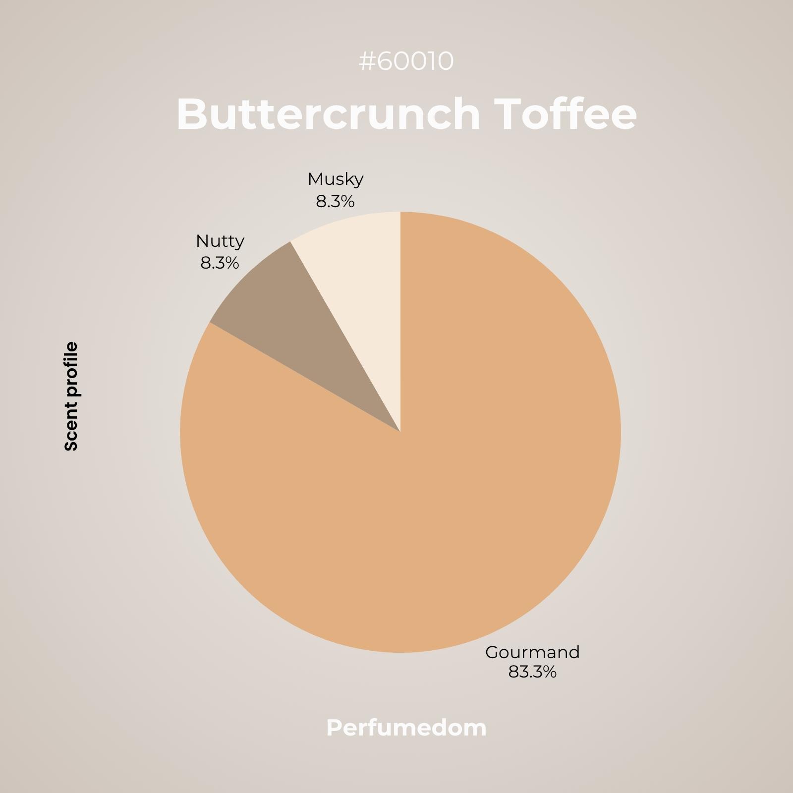 Buttercrunch Toffee is a rich, buttery scent that captures the irresistible aroma of golden caramelized sugar. It opens with a touch of toasted almond, melted butter, and brown sugar, giving a slightly crisp, nutty sweetness. The heart melts into warm milk and deep caramel, while the base lingers with smooth tonka, creamy vanilla, and a hint of musk. Low in allergens, and CLP-safe, making it suitable for a wide range of applications.