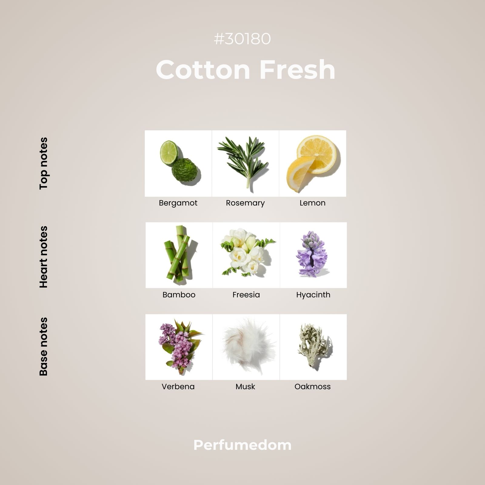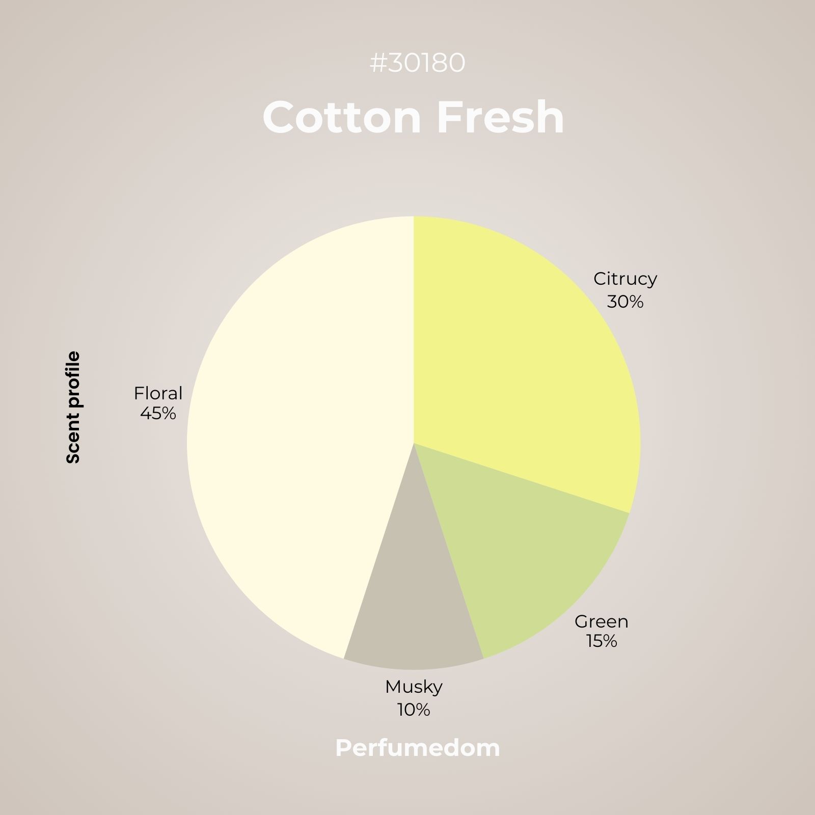 Cotton Fresh Fragrance Oil is a vivid aldehydic aroma reflecting the sense of freshly laundred linen. Top notes of bergamot and lemon, a transluscent accord of rosemary, bamboo, water hyacynth and freesia at its heart, on a base of white musk, verbena and oakmoss.
