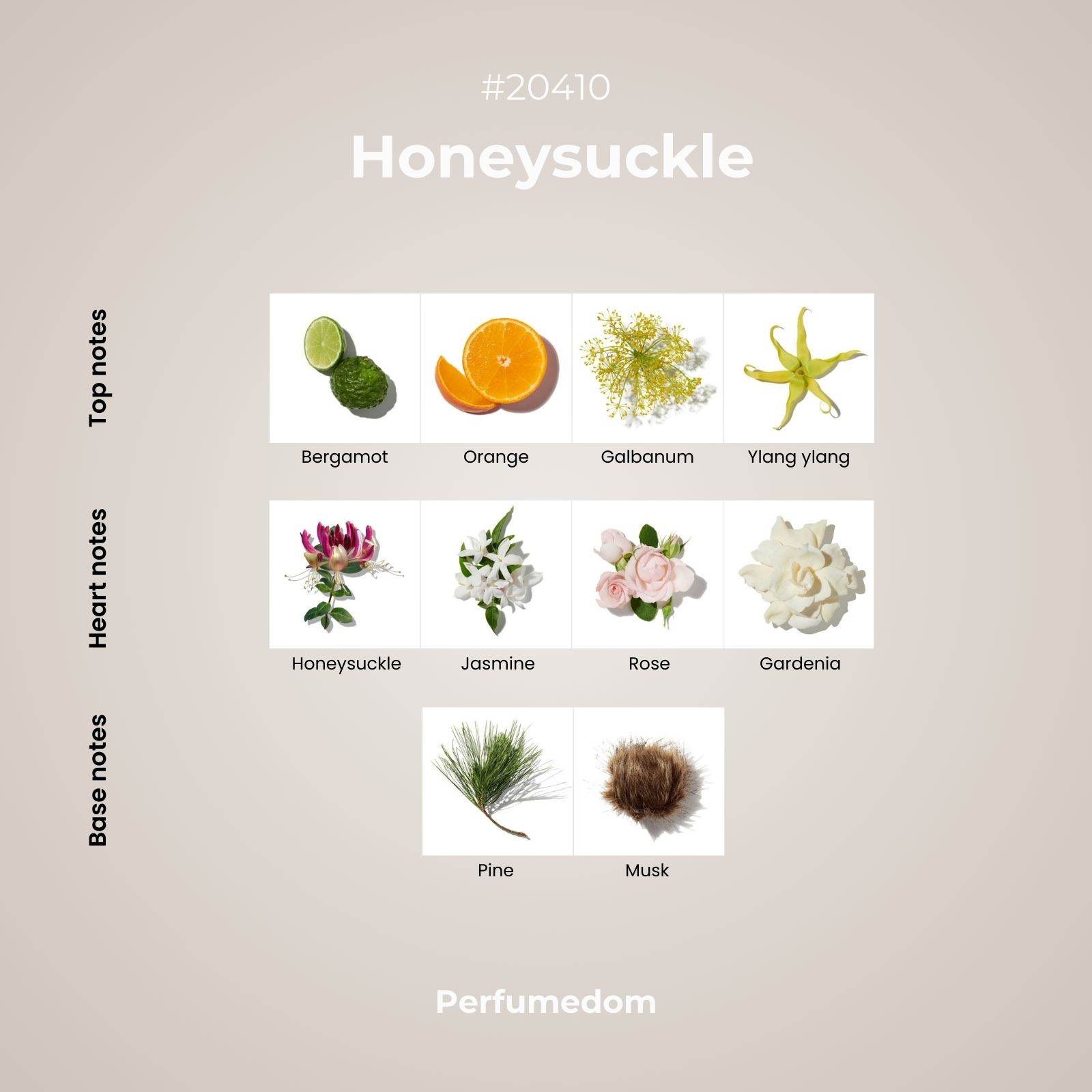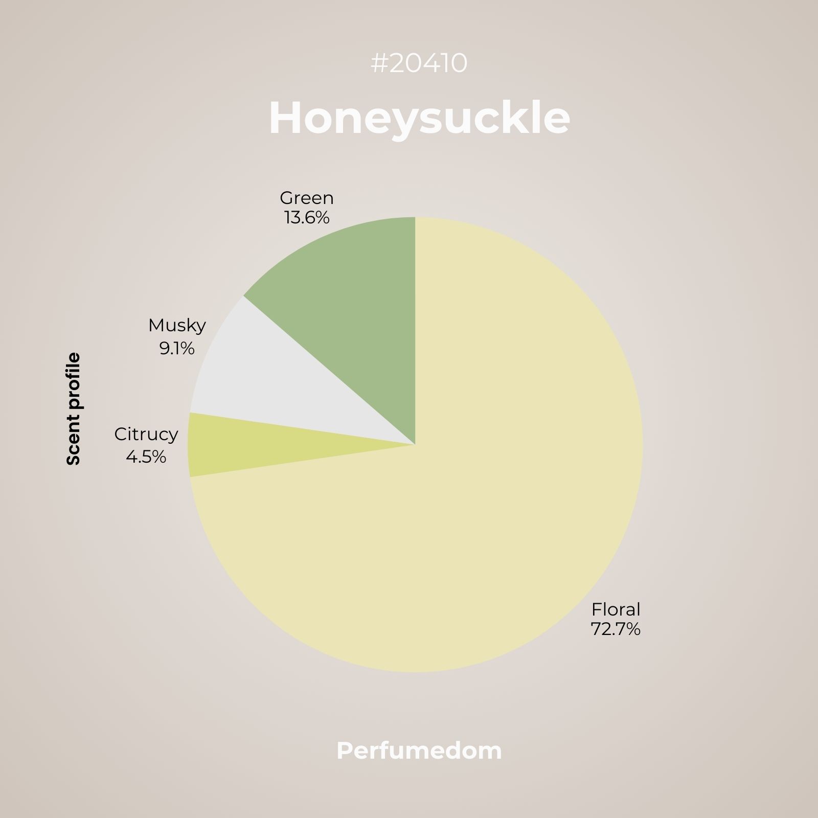 Honeysuckle Fragrance Oil is a bright all-natural scent capturing the very essence of that lovely garden flower. The fragrance opens with fresh citrucy notes of bergamot, orange, galbanum and ylang-ylang. A slight aldehydic heart of jasmine, rose, gardenia, pine and honeysuckle dominates the fragrance, supported by a fougere-like base of green musk.