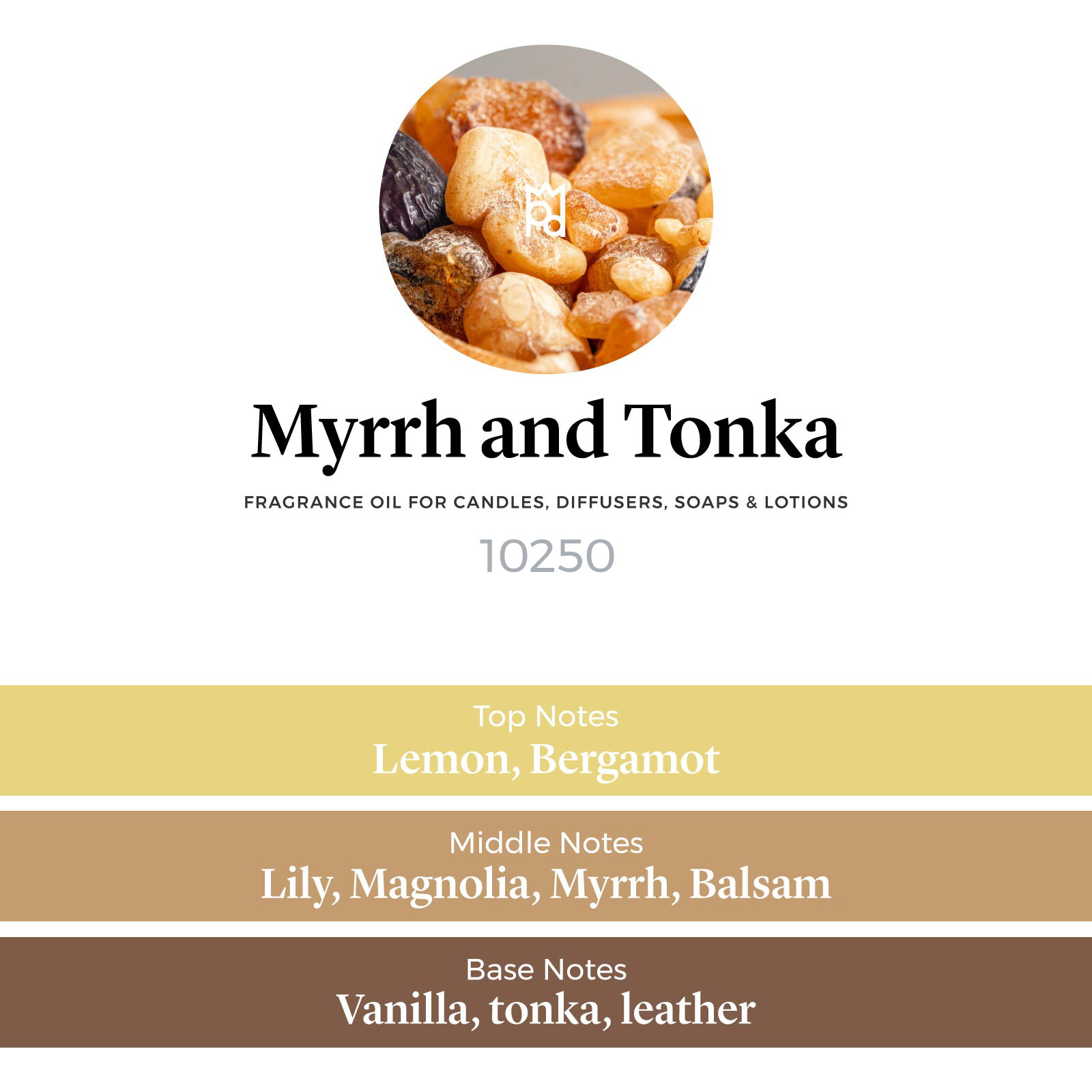 Myrrh and Tonka Fragrance Oil is a premium balsamic blend of warm myrrh and sweet tonka that produces a silky smooth and embracing aroma. The middle notes which host our precious myrrh are perfectly combined with soft florals and balsam, while the base features one of the most elegant and luxurious accords of vanilla, tonka and leather. A fragrance that is ideal for Christmas and also for all your winter themed scented creations!