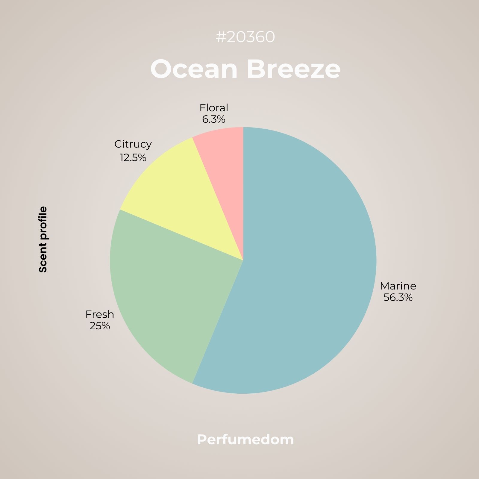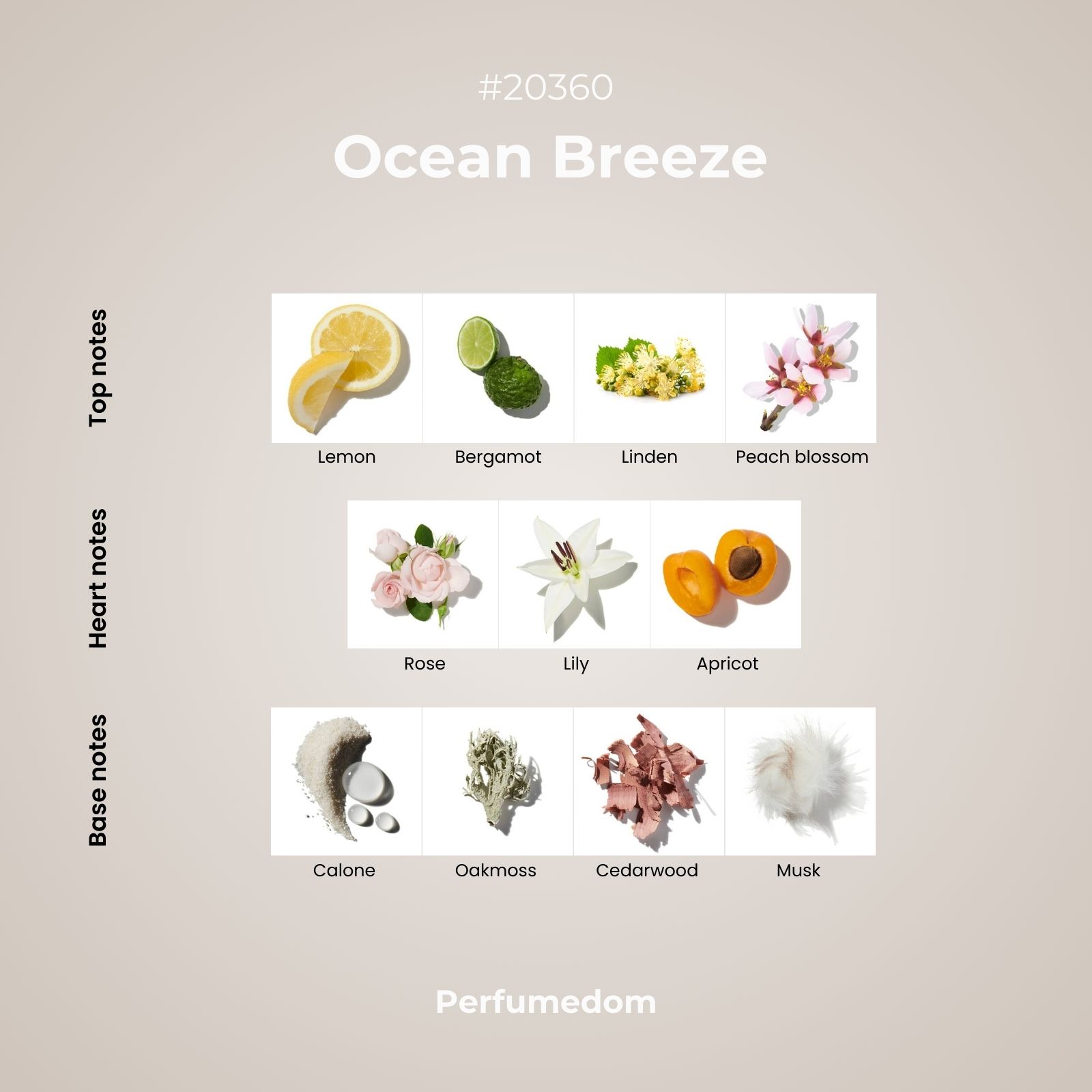 Ocean Breeze Fragrance Oil is a refreshing and breathy blend with a clean citrus accord on the top consisting of lemon, bergamot, linden and peach blossoms. A marine base of oakmoss, cedar and musk supports a bright floral heart of rose, apricot and lily.