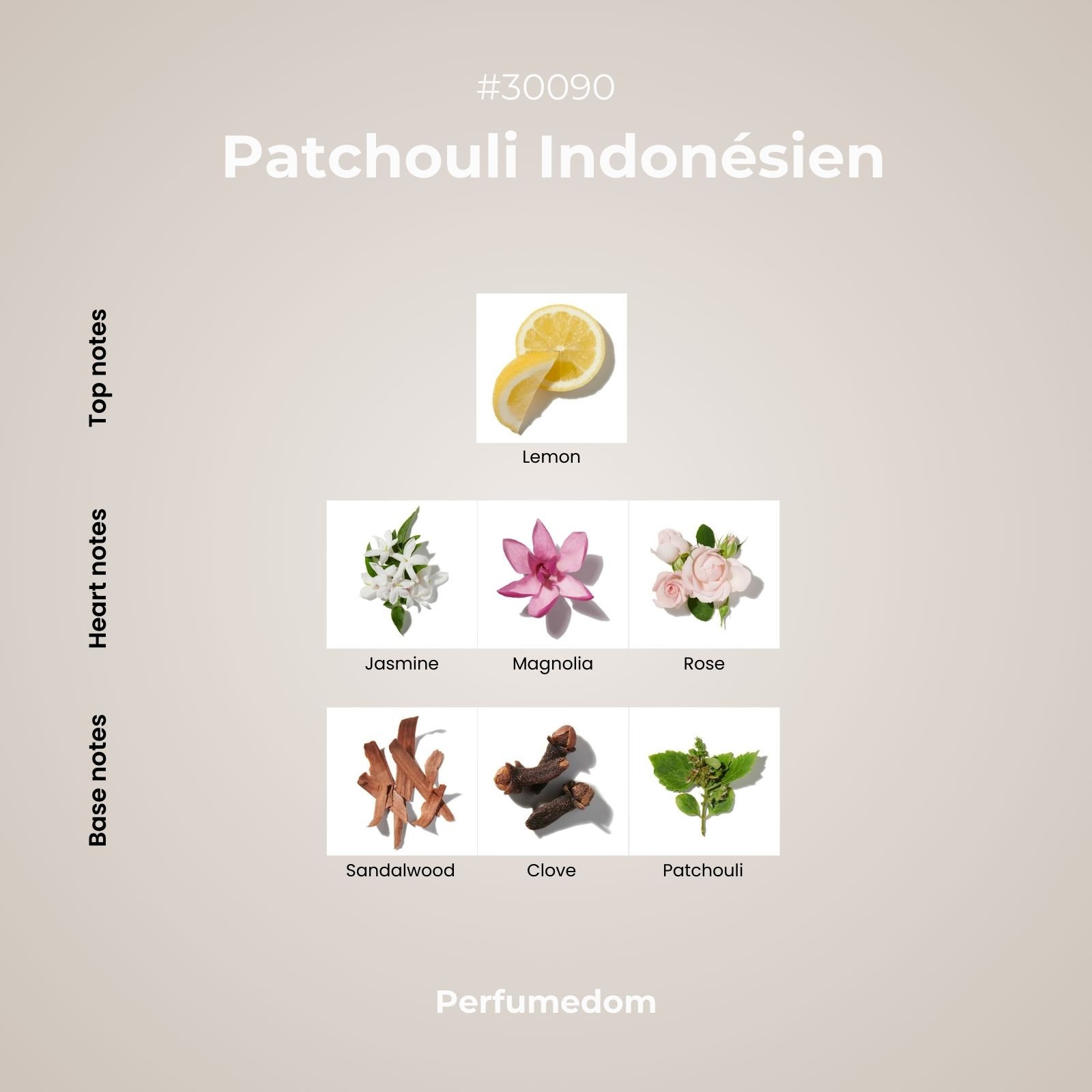 Patchouli Indonésien Fragrance Oil is a sensual woody floral fragrance based on the deep, alluring scent of Indonesian patchouli balanced with fresh lemon on the top. A rich blooming white floral heart of midnight jasmin, magnolia and rose sits at the middle of the composition while an exotic base of patchouli, clove and sandalwood support the base.