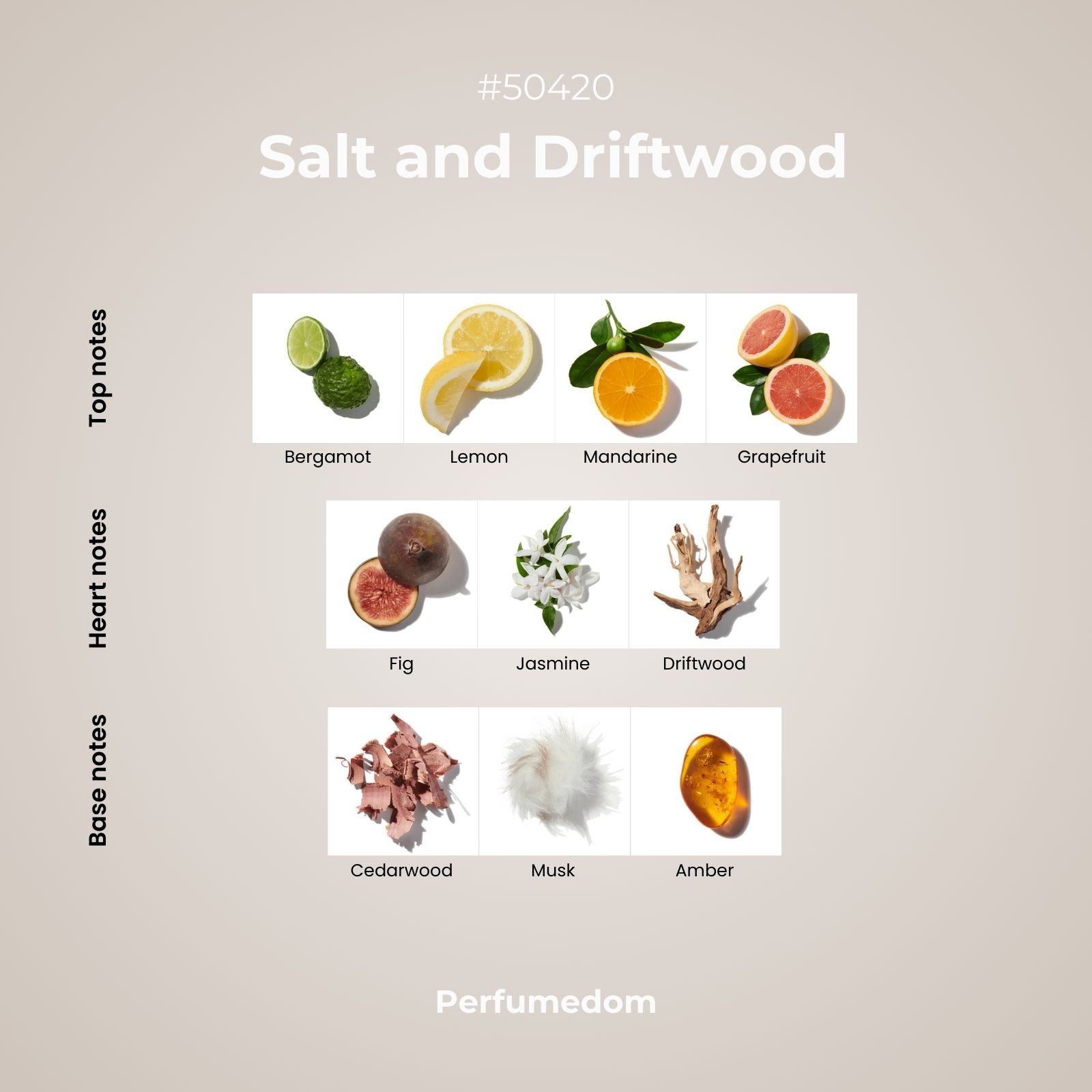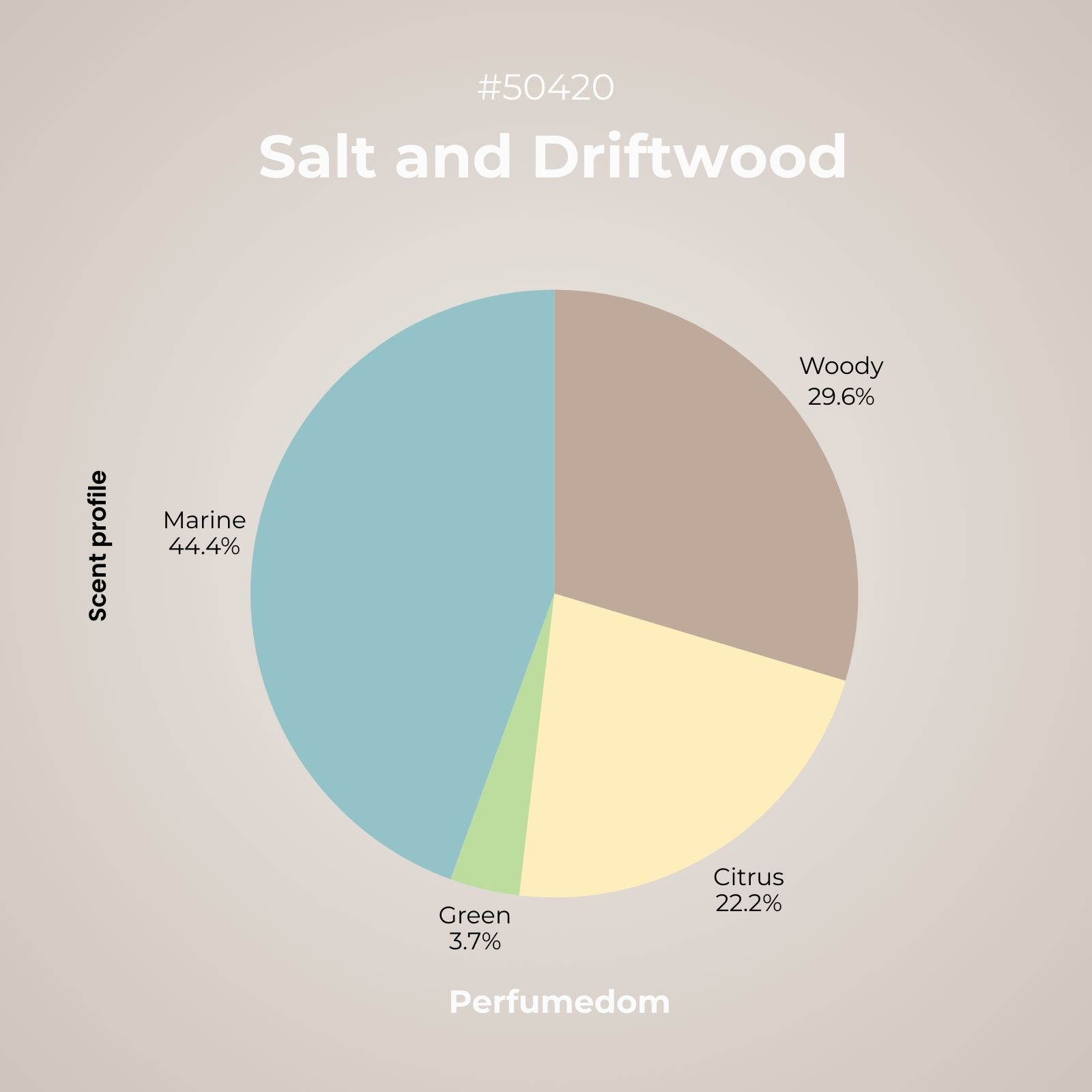 Salt and Driftwood Fragrance Oil is a sunny coastal blend that combines the salty essence of the splashing waves with warm woody notes, evoking a brisk walk along the sea shore at sunrise. The entire top part of the fragrance is based on a crisp and fresh citrus symphony white in the heart we find a luxurious floral/woody accord of dried figs, jasmine and driftwood. The wood nature of the blend is further accentuated with cedarwood on the base along with white musk and amber.