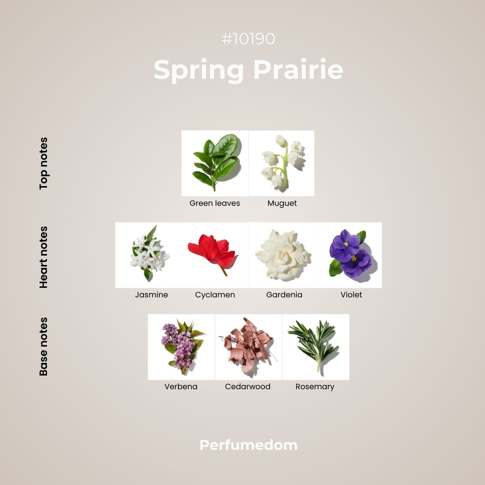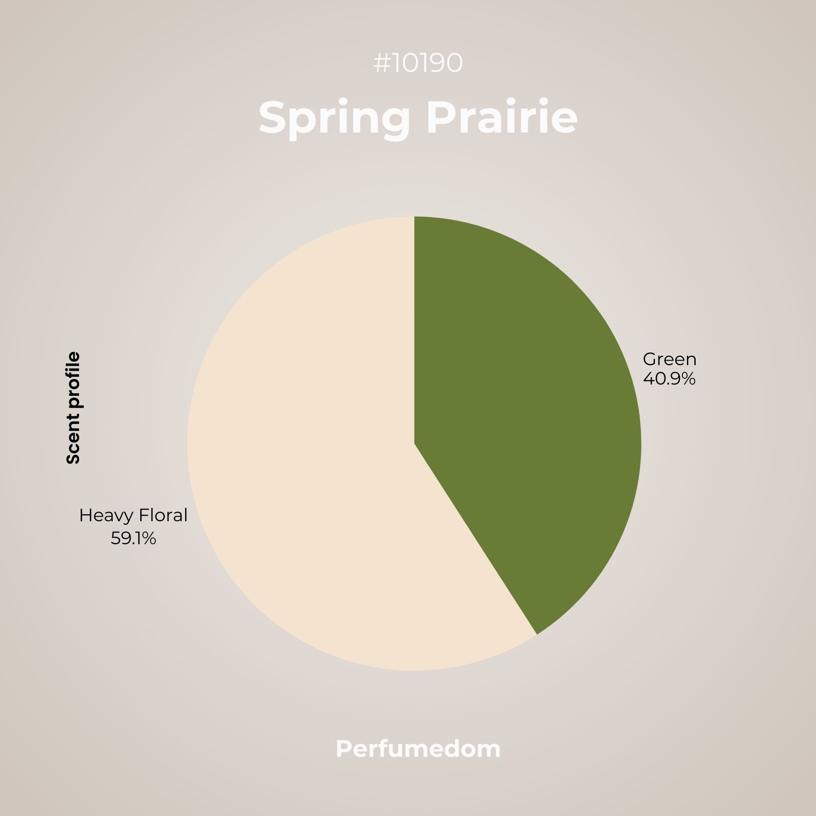 Spring Prairie Fragrance Oil is a fresh green-floral blend like a walk on the countryside on a cold spring morning. Soft green accords intertwine with freshly cut muguet, jasmine, cyclamen, gardenia and wild violet on a green/woody base of verbena, rosemary and cedarwood. A breath of fresh air that rejuventates the body and uplifts the spirit.