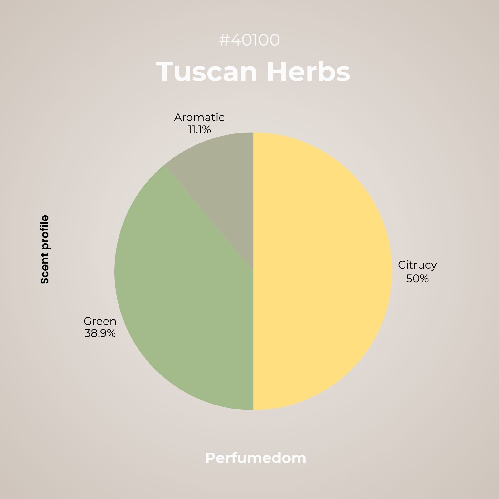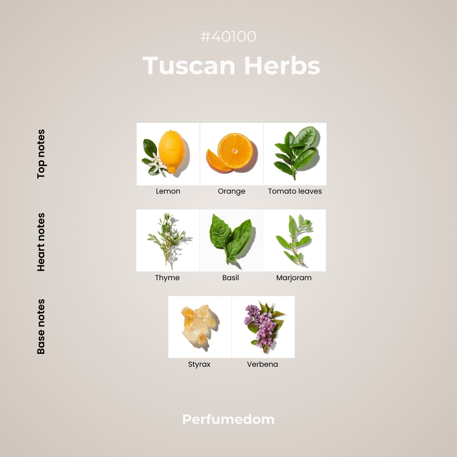 Tuscan Herbs Fragrance Oil is an unforgetable journey to the famous countryside of Tuscany, Florence. A bright green accord of lemon, orange peel, tomato leaves, freshly picked thyme and basil is harmoniously paired with a warm base of aromatic woods, a touch of styrax and lemon verbena.
