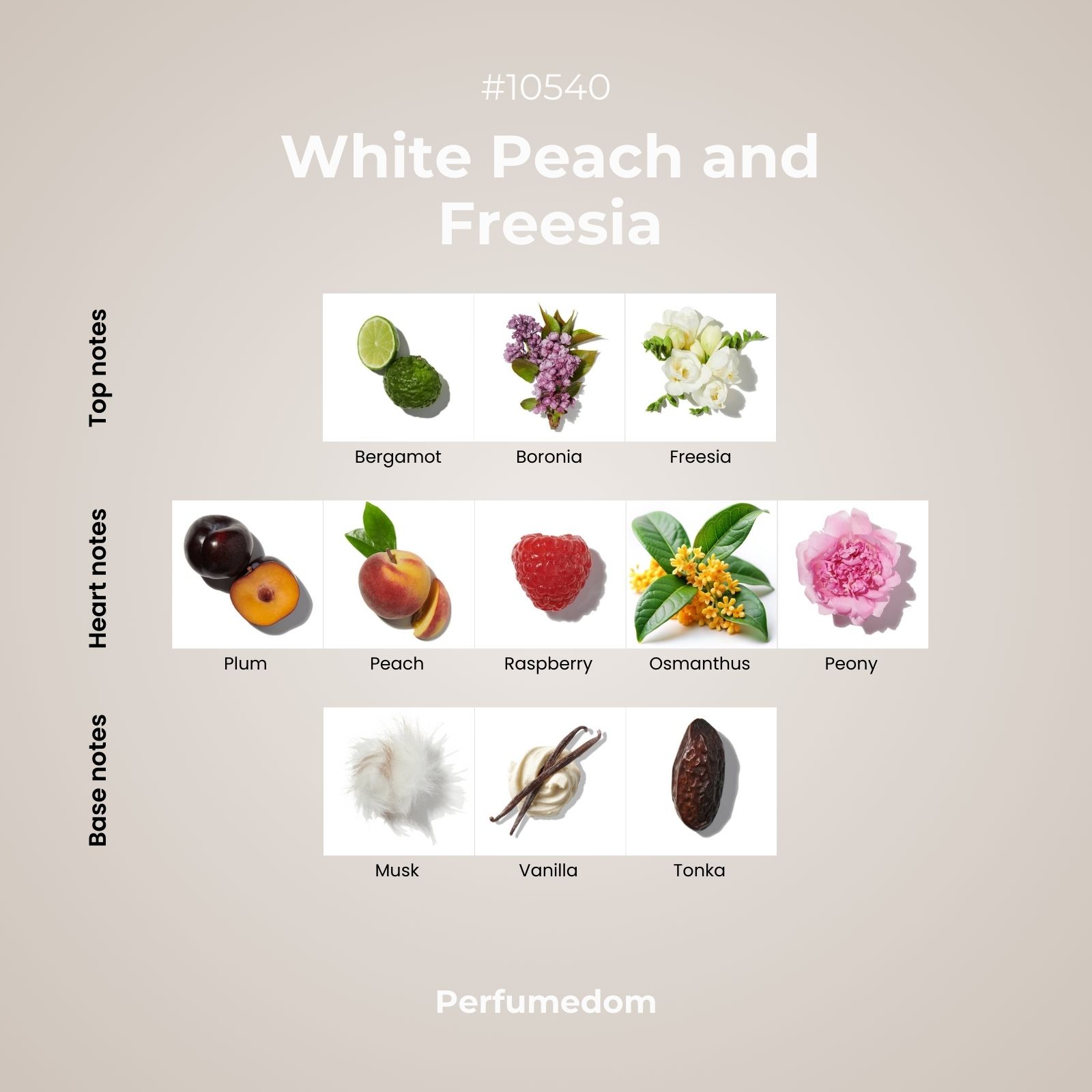 White Peach and Freesia Fragrance Oil is a luscious combination of fresh summer fruits and intensly fragrant flowers on a creamy base of tonka, musk and vanilla. A sunny accord of bergamot, freesia and boronia sets the scene for the highly sophisticated heart of white peach, plum, raspberry, peony and osmanthus creating a harmonious symphony of juicy and blossoming aromas. Playful yet refined, this fragrance manages to balance masterfully between fruity, floral and balsamic notes exuding a luxurious scent output.